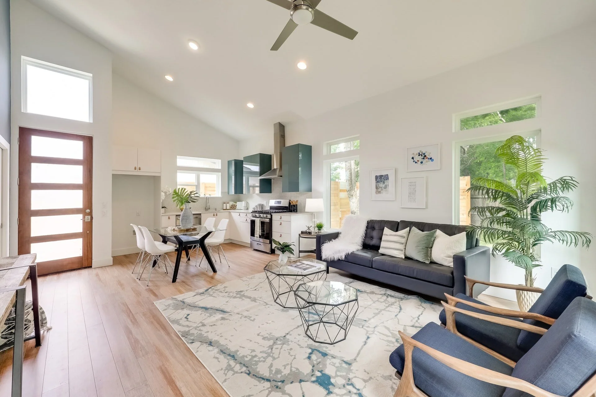 Ready to add a back house to increase rental income or to condo regime and sell to pay off your mortgage? Having designed, built, and directed dozens of these ADUs in Austin, I can guide you through the process. I can separate fact from fiction. Plan on spending about $200 per square foot, but with values and rents going up, this is still a great way to add cash flow or equity to your property. Plus I have financing for 3.5% I can set you up with! We can help you finance, design, strategize, and partner with a reputable GC. Call me today for your consultation. Here is one of the recent ADUs (backyard apartments) we directed for repeat investor clients with architectural services by Ochona and building by Avery Building Company. This one is 1,099 square feet, 2 bedrooms, 2 bathrooms, and for sale for 350k. 1107 Estes Ave 78721 is inspired by Scandinavian design. We optimized the floor plan of this small home, added plenty of natural light, and used copper fixtures with hand-glazed tile to enhance the interior space.